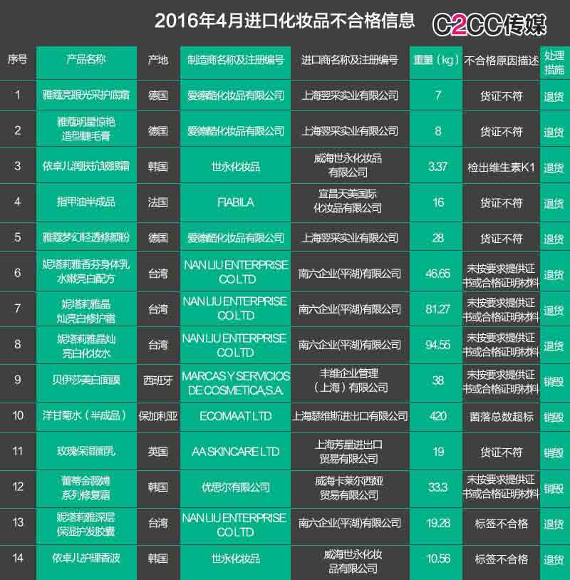 6月1日,質檢總局發布了2016年4月進口食品化妝品不合格信息,共237批,其中不合格化妝品占14批,涉及雅蔻亮眼光采護底霜、貝伊莎美白面膜等產品,產地包括德國、韓國、法國等。