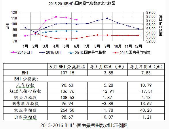 從“2015-2016BHI與國房景氣指數對比示例圖”中可見,2016年上半年國房景氣指數整體位于2015年上方,且2-5月逐月上漲,6月國房景氣指數微跌(2015年2-5月逐漸走低,6月止跌微升)。進而分析2016年上半年,全國樓市在“去庫存”的大背景下,房地產政策偏向寬松,降準降息、調整首次置業首付款比例等購房層面刺激政策接連出臺,不斷刺激房地產市場需求釋放,樓市上半年整體呈現量增價漲格局。
