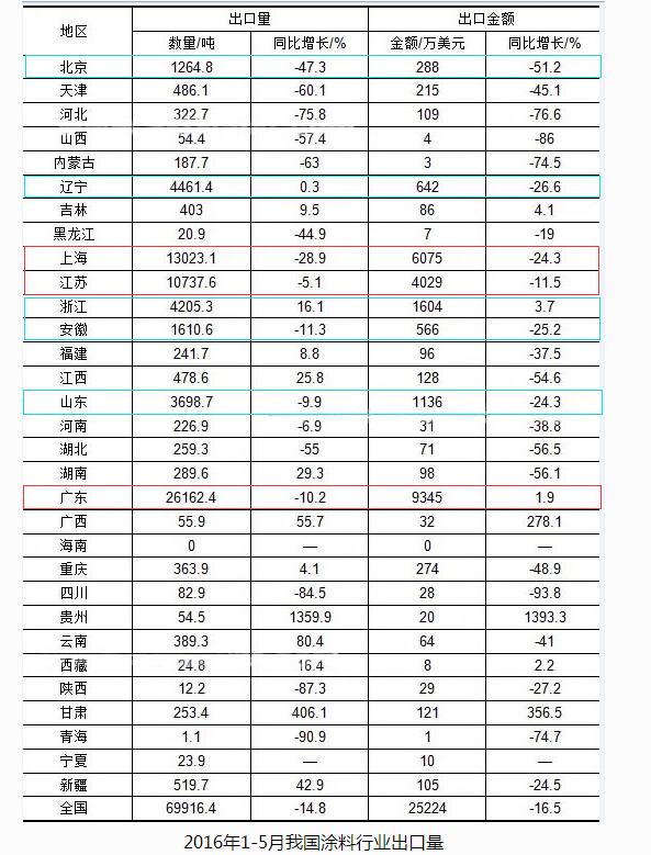 第一,廣東、江蘇和上海作為涂料大省,從最新地區涂料行業出口量數據來看(下圖),2016年1-5月我國涂料行業出口量累計達到6.99萬噸,同比下降14.8%,出口金額累計2.52億美元,同比下降16.5%。雖然出口量整體呈現不同程度的下降,但整體看,廣東、江蘇和上海仍舊是出口大省,出口數量在萬噸以上。